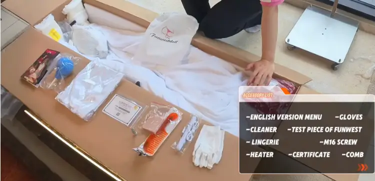 Typically, each order includes an English user manual, cleaner, basic lingerie, gloves, an M16 screw, a comb, and a vaginal cleaning device.